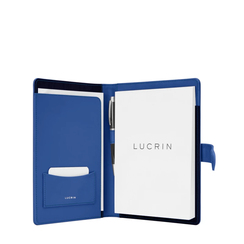 A5 Portfolio with strap Leather A5 portfolio with strap clasp. A flat pocket to the right and an added pocket for business cards. Pen loop. Ideal for business men, managers or professionals.
