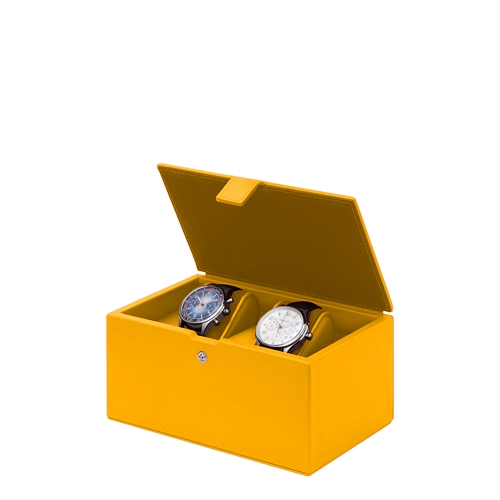 An absolute masterpiece in terms of watch protection, this leather box for 2 watches is basically made of wood, covered expertly with authentic leather. An elegant watch case that has two removable cushions inside. This box for watches has a snap button closure, which adds more security. This refined leather watch box can be customised with a beautiful unique engraving and is available in a sublime array of colours.