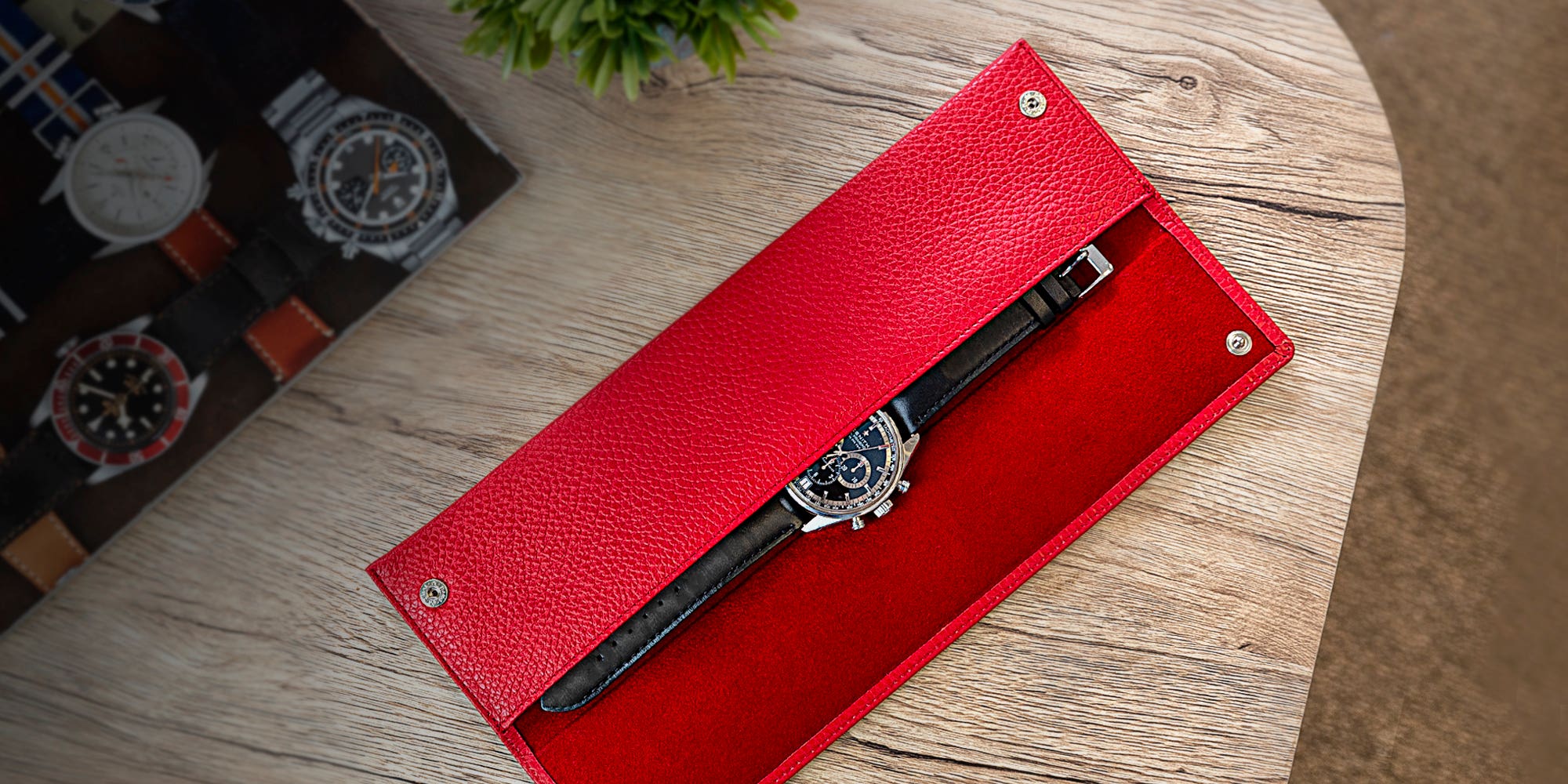 This semi-rigid, rectangular leather watch pouch is ideal for travellers especially, and can also be the perfect gift for watch lovers. The flap closure with 2 snap buttons makes it easy to insert and remove your watch from the case, while keeping it totally secure when shut. If you wish to gift a watch to someone special, this leather watch pouch will make the perfect “gift wrap”. The watch travel pouch can be personalized with a beautiful engraving for example.
