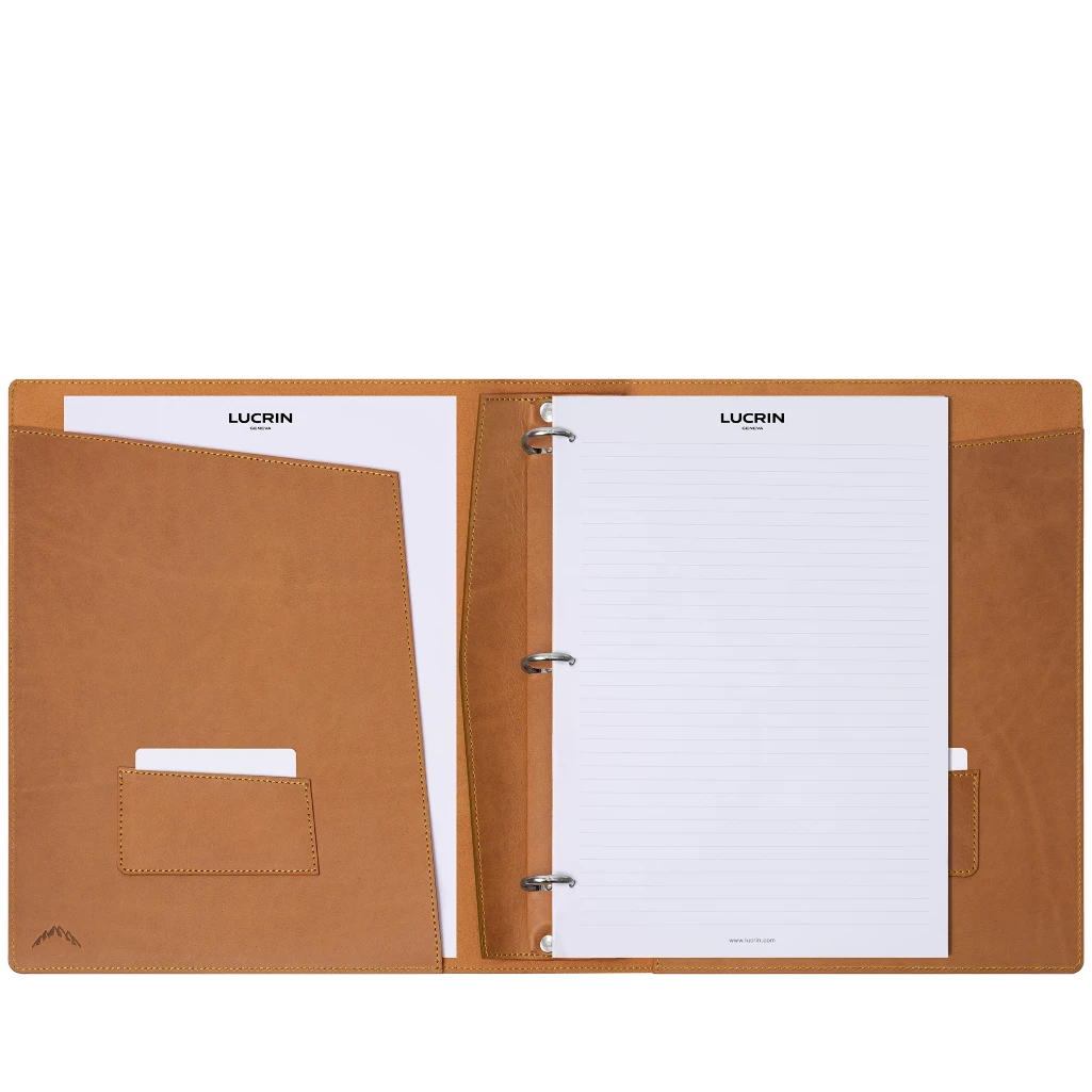 Discover the Highland Flex Binder US Letter (3-ring), crafted in full-grain leather from the Alpine Collection and designed to evolve with you over time. Created for professionals, consultants, executives and students working in US Letter format, this leather ring binder keeps reports, contracts and presentations perfectly aligned without trimming or folding. The 3-ring mechanism ensures seamless compatibility with standard US Letter inserts, while two flat interior pockets keep loose sheets securely in place between meetings or lectures. Over time, the leather develops a rich natural patina, making this leather ring binder increasingly personal with every project you complete. Choose your color, coordinate the thread tone and emboss your initials to create a personalized leather ring binder that reflects your way of working. Make it yours.
