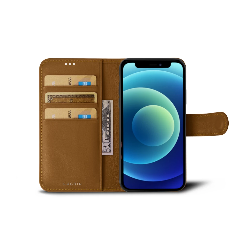 The classic wallet case for iPhone 12 mini by LUCRIN Geneva is not a revolutionary product by all means, but a convenient and popular one nonetheless. Sleek, ergonomic and roomy - this classic wallet case lets you ditch your usual wallet altogether for something lighter and more functional. A design perfected throughout the years; this wallet case will withstand the test of time. In addition to the interior lateral pocket, there are 3 pockets included to fit cash, a few cards and identification within this sleek case. A shock-resistant silicone case holds your phone while the microfibre knitting of the case’s interior protects your iPhone 12 mini. Elevate the style value of your leather wallet case through customization by choosing among the several colorways and engraving options.