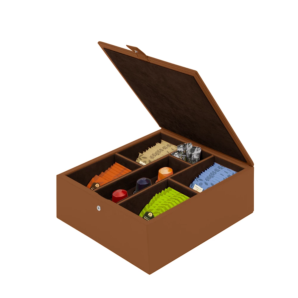 Start your day with a refined coffee or tea ritual. Designed for discerning hosts and those who like everything in its place, this coffee and tea organizer turns daily routines into moments of calm. Handcrafted in our ateliers, it brings understated elegance and structure to your tea and coffee station. The hand-finished wooden box is wrapped in full-grain leather and lined with soft microfiber to cushion its contents. Inside, nine compartments organize your essentials: four for tea bags or herbal infusions, one central square for sugar, three for coffee capsules, and a hidden drawer for refills — revealed by a gentle pull of the tab. A press-stud fastening keeps everything neatly in place. Ideal for kitchen counters, meeting rooms, or thoughtful gifting, this coffee and tea organizer LUCRIN is yours to personalise. Select your leather, pick your color, and add a monogram to create a piece that’s unmistakably yours. Add it to your space — and make every coffee or tea moment beautifully your own.