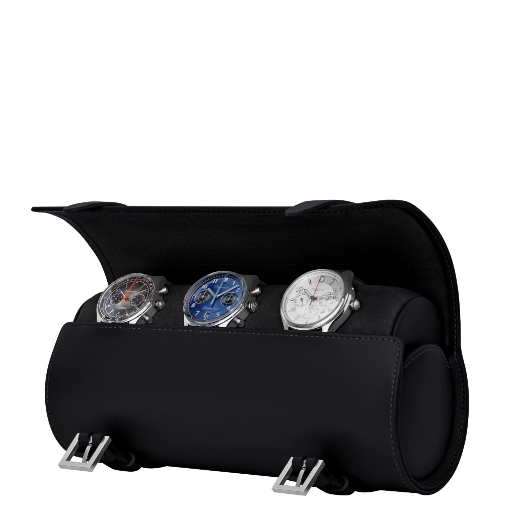 To help you protect your most coveted watches, LUCRIN presents the deluxe watch roll case made in authentic leather. Inside, you will find a cylindrical cushion which can hold up to 4 watches of standard size. The interior is lined with soft microfibre to keep your watches safe from cosmetic wear during your trips. The watch holder is held secure by two leather straps with silver-coloured buckles. Should you want to make it even more special, choose to customise it with text engraving or a different thread colour.