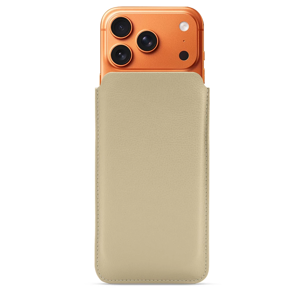 Created for those who value refined simplicity, this iPhone 17 Pro Max classic sleeve offers protection in a sleek, understated design. Its snug shape follows the contours of your device, slipping effortlessly into any pocket or bag. Handcrafted in full-grain leather, this iPhone 17 Pro Max sleeve softens over time and adapts naturally to your phone. Inside, a smooth microfiber lining adds a touch of refinement while shielding your screen and back from everyday scuffs. Free from closures or superfluous elements, this iPhone leather sleeve keeps the focus on craftsmanship and ease. Personalized by you, crafted by us — choose your leather, select your color, and add a monogram that tells your story. Make this custom iPhone leather sleeve a part of your everyday life!