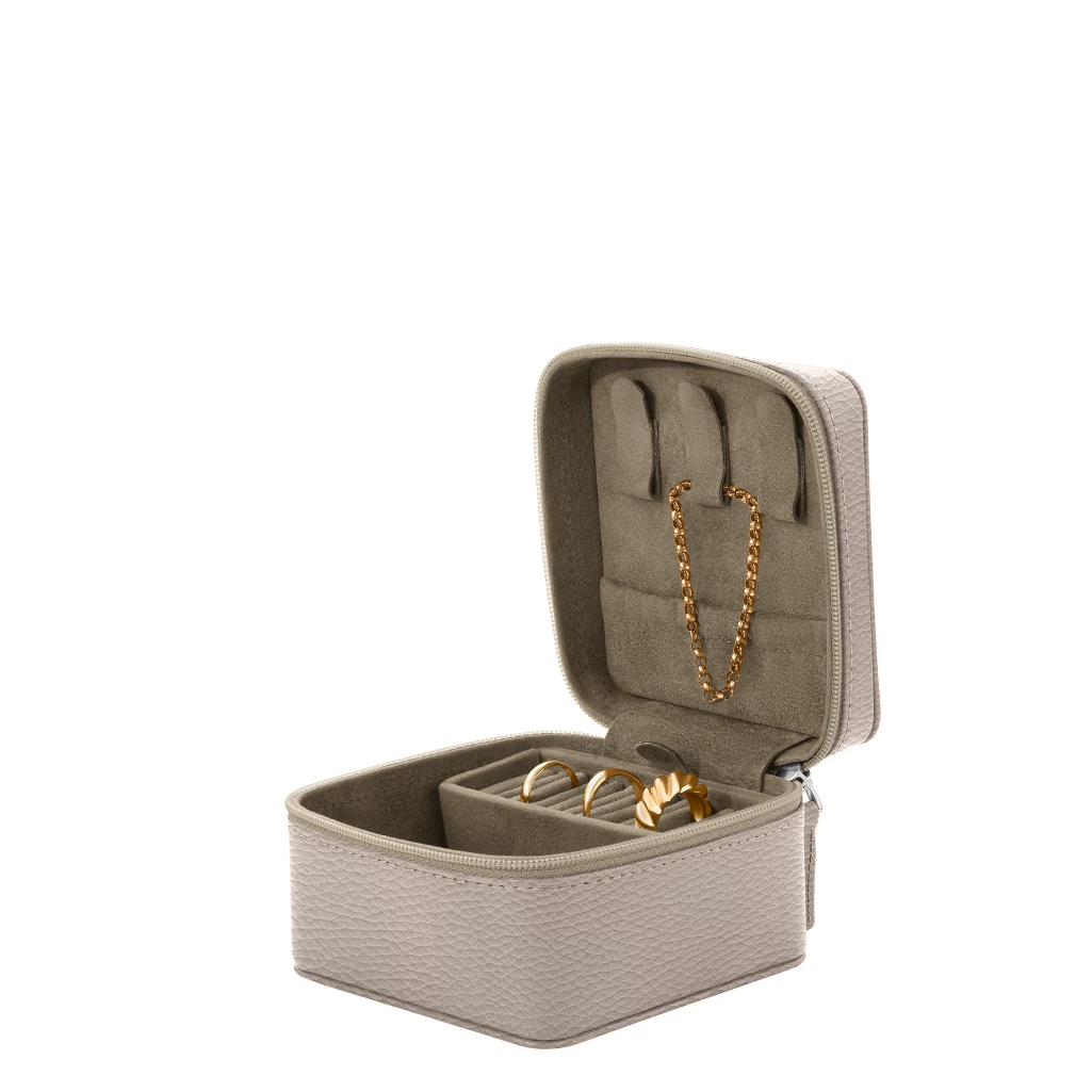 Level-up your organisation game with the LUCRIN Geneva jewelry organizer. This compact leather organizer is designed to maximize your space efficiently. Bid farewell to cluttered dressing tables and tangled accessories. With dedicated slots for earrings and rings, this organizer is perfect for on-the-go use. The lid also features an elasticated side pouch for smaller items. The zip closure ensures your jewelry stays securely in place, while the soft velvety interior prevents scratches and damage, preserving their beauty for years to come. Customize the leather color and type to match your decor, and add a monogram for a unique touch.