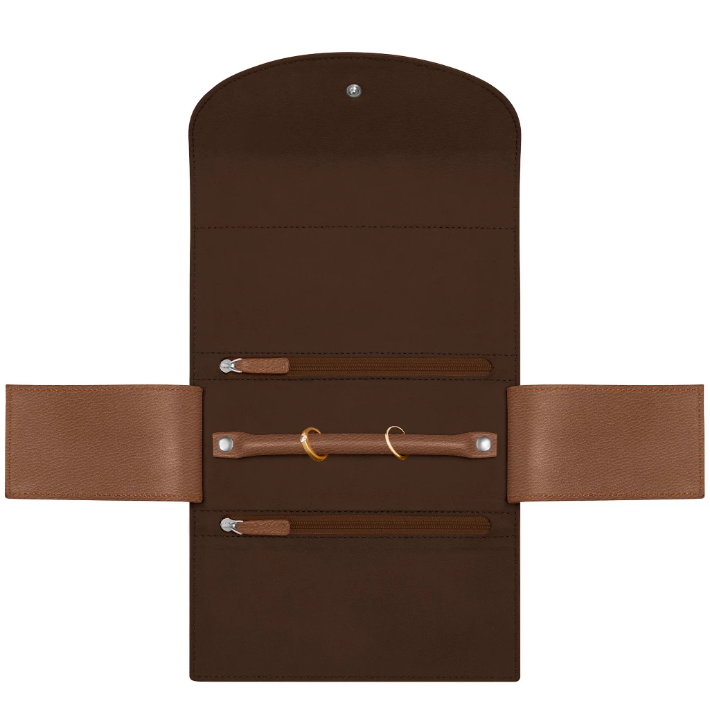 Made from natural leather, this wonderful jewelry pouch consists mainly of two zipped pockets in which you can store your bracelet, necklace and any other charms! Another interesting feature is a delicately placed leather bar, right in the middle, where you are able to slip on your rings. The pressure studs at the bar’s ends make sure that your rings are kept well in place. This is an elegant and handy leather jewelry pouch reliable enough to keep your precious ornaments safe and tidy, whether at home or on your travels.