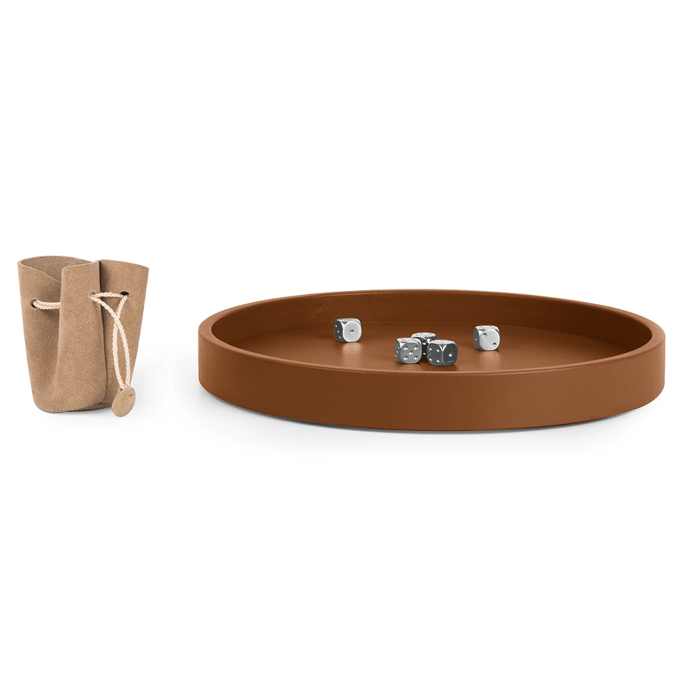 Dice games are widely popular given the range of games you can play with those - Backgammon, Bunco, Ludo, Bar Dice, Yahtzee, amongst others. This is why we are presenting a magnificent dice rolling tray to complement your games. It is basically a solid round wooden tray expertly covered in luxury leather. The leather dice tray comes with a complementary Suede calf leather drawstring pouch, containing five solid metal dice (Stainless Steel 316L). Great gift idea for the amateurs of table, board and parlour games. You may even engrave initials or maybe even the game name on the leather surface.