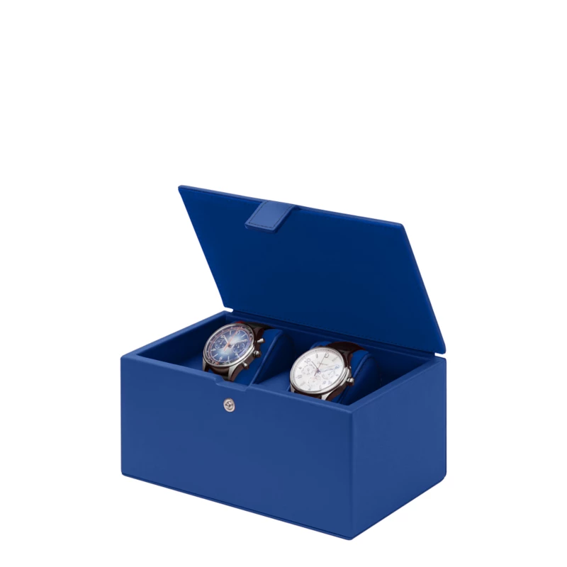 An absolute masterpiece in terms of watch protection, this leather box for 2 watches is basically made of wood, covered expertly with authentic leather. An elegant watch case that has two removable cushions inside. This box for watches has a snap button closure, which adds more security. This refined leather watch box can be customised with a beautiful unique engraving and is available in a sublime array of colours.