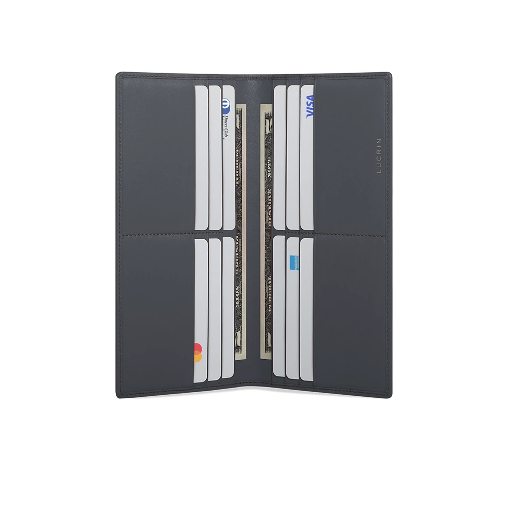 Keep your cards safely organised with this unique leather card wallet by LUCRIN Geneva. Inside, you will find 6 card slots on each side that can accomodate up to 12 cards, as well as a slot dedicated for bills and notes. The compact size makes it the perfect companion for your daily errands or even your trips, simply slip it into your bag and get easy access to your cards in just one accesory. This card wallet makes the perfect gift for anyone who is always on the go. Make it unique by choosing the leather colour and type that suit your style. Add an engraving of your choice for a touch of personalisation.