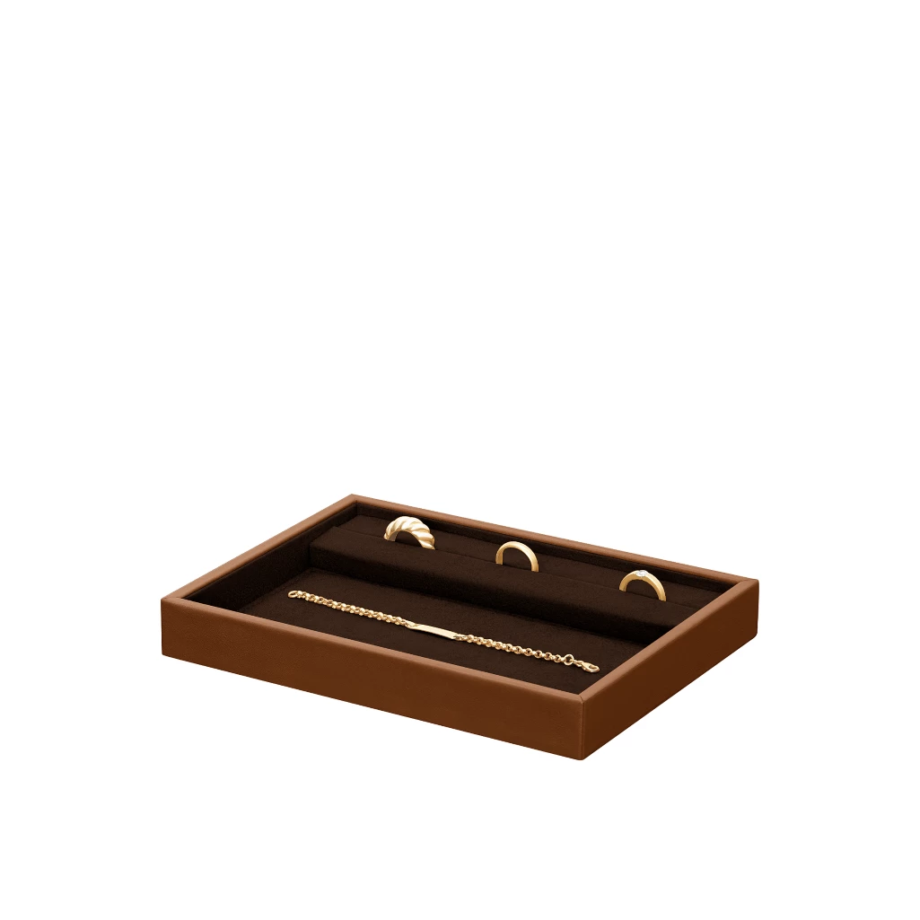 Very practical thanks to its slit for rings, this compact-size display leather tray can hold your jewellery and other precious belongings with a sure touch of elegance! This tray is very useful to jewellers who know how to enhance their crafts by presenting them in the most refined form to their customers. The interior surface of this jewellery display tray is conceived with microfiber, thus offering guaranteed protection to your precious belongings.