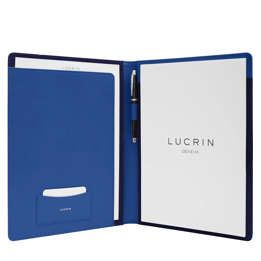 Discover one of LUCRIN Geneva’s finest creations: the A4 Portfolio crafted in premium full-grain leather. Meticulously designed with remarkable attention to detail, this leather compendium is the perfect office companion for discerning professionals. The right side features a spacious slot that securely holds an A4 notepad, while the left side includes a flat open pocket (11.4 x 8.1 in) for documents and a dedicated business card pocket (4.1 x 2 in). A refined pen loop—crafted to hold pens up to 0.55 in in diameter—adds to the portfolio’s functionality. Once the included A4-format notepad is used, it can easily be replaced with any standard A4 or US Letter-size refill. Delivered with a complimentary A4 notepad refill, this portfolio blends elegance, practicality, and expert craftsmanship in a timeless professional accessory.