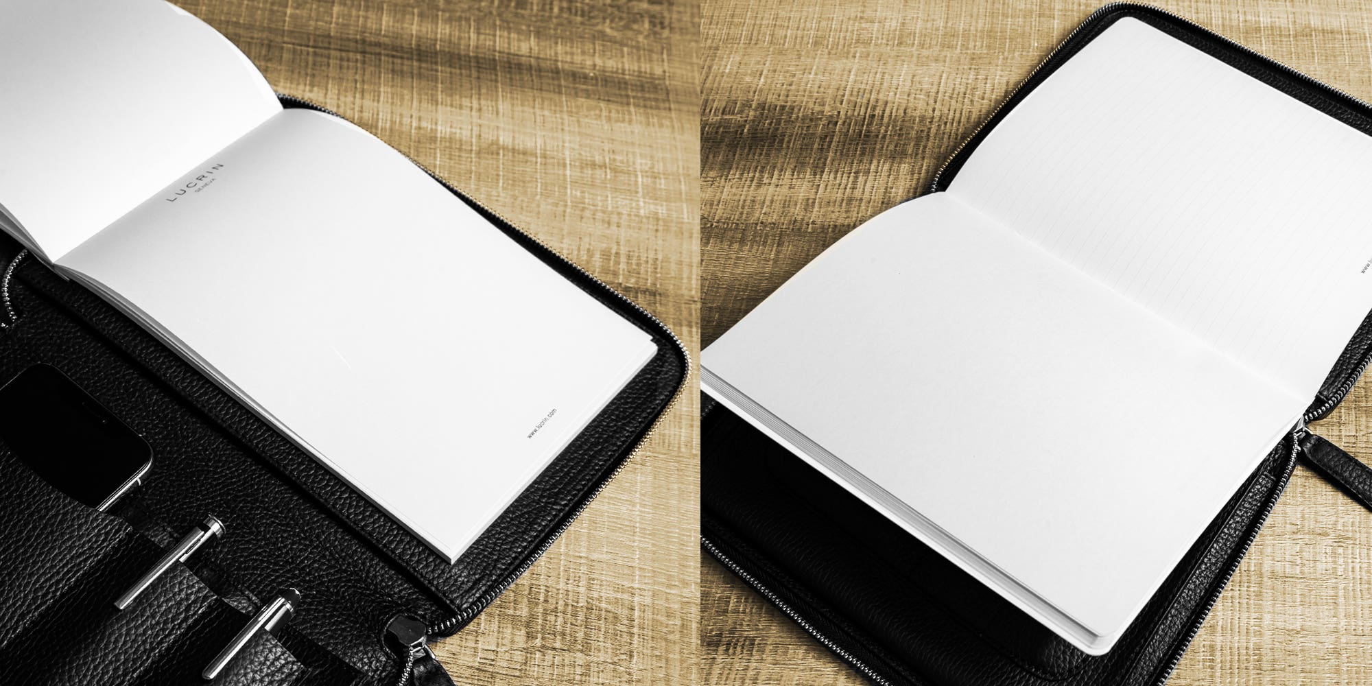 Delivered with a Lucrin A5 Notepad of 50 sheets (ref.: ROS2000) and compatible with a Lucrin A5 Copybook of 48 sheets (ref.: ROS2063-2).
