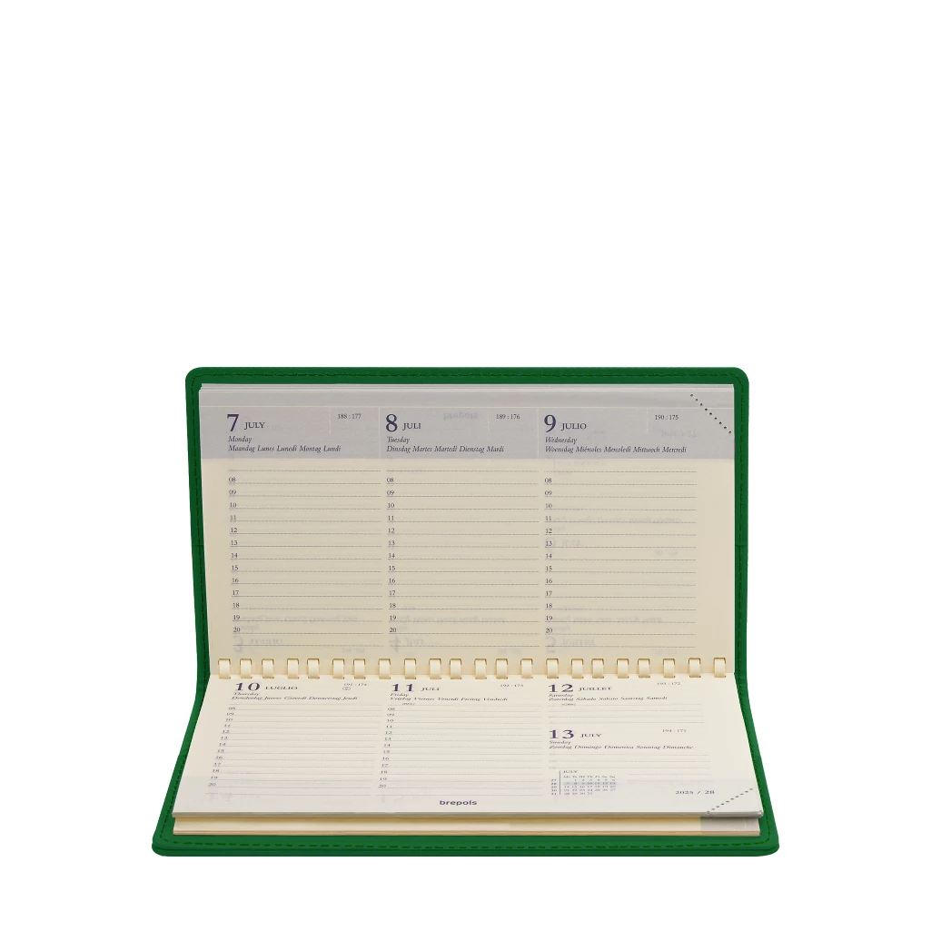 Pocket 2026 diary/organizer in full grain leather. Delivered with an Omniplan Brepols spiral-bound, week-on-two pages planning diary for the year, a phone index, a planning and world maps. Diaries start from January 1st, to December 31st
