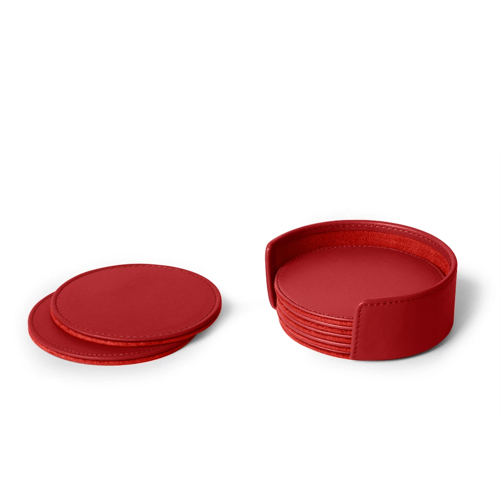 Welcome your guests with a touch of class and refinement by setting your dining or coffee table with these leather drink coasters. Designed to protect your surfaces from the usual rings left by glasses, this coasters set combines elegance and practicality. Each coaster is crafted in authentic premium leather on the outside and soft microfiber underneath, offering both durability and surface protection. Once your guests have left, simply store your drink coaster set in its matching rack, also handcrafted from the same high-end leather. This set of 6 luxury leather coasters fits beautifully into any home interior but is equally perfect for conference rooms or board meetings where drinks are served. Entirely handmade, these handcrafted coasters can also be customized to reflect your personal style. Add initials or a name to create personalized leather coasters—a sophisticated and functional accessory for any décor.