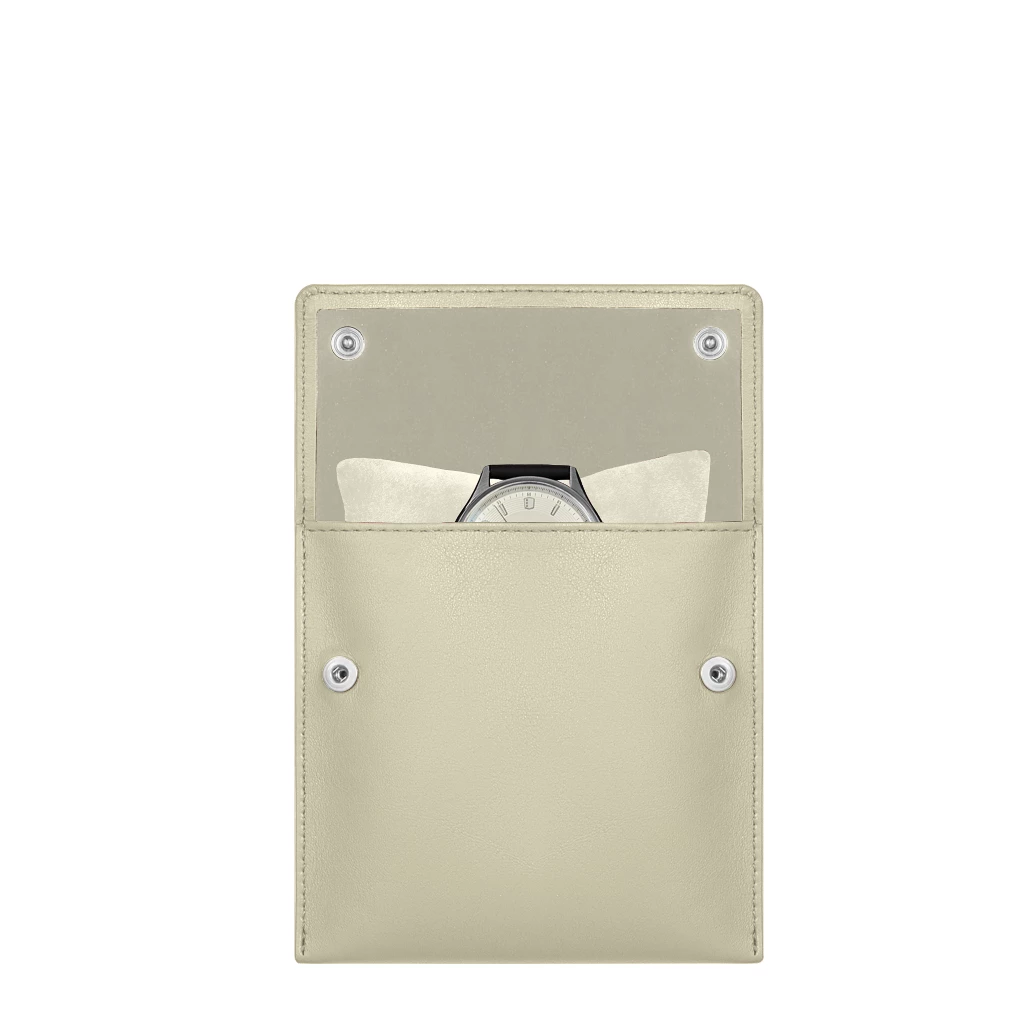 Used especially during travel, this soft watch holder for men or women is made in high-end authentic leather. Wrap your luxury watch around the microfiber lined cushion, slip it inside the square watch pouch and close it with the 2 snap buttons. Your watch will be protected in this elegant watch travel case in leather, which you may even customize with the engraving of your initials for instance.