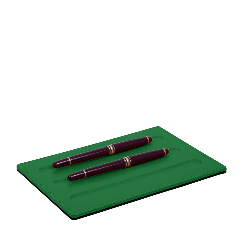 Prime quality leather pen tray. This tray for 3 pens blends in perfectly with all our office articles; it is the ideal complement for blotters (Ref: OS1003). Maximum pen length 6.7 inches, width 0.6 inches. Customize this accessory to add a personal touch to your office workspace. Sold without pens.